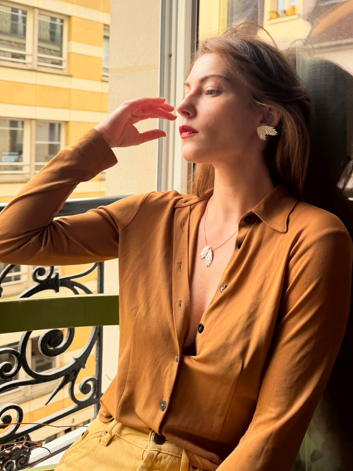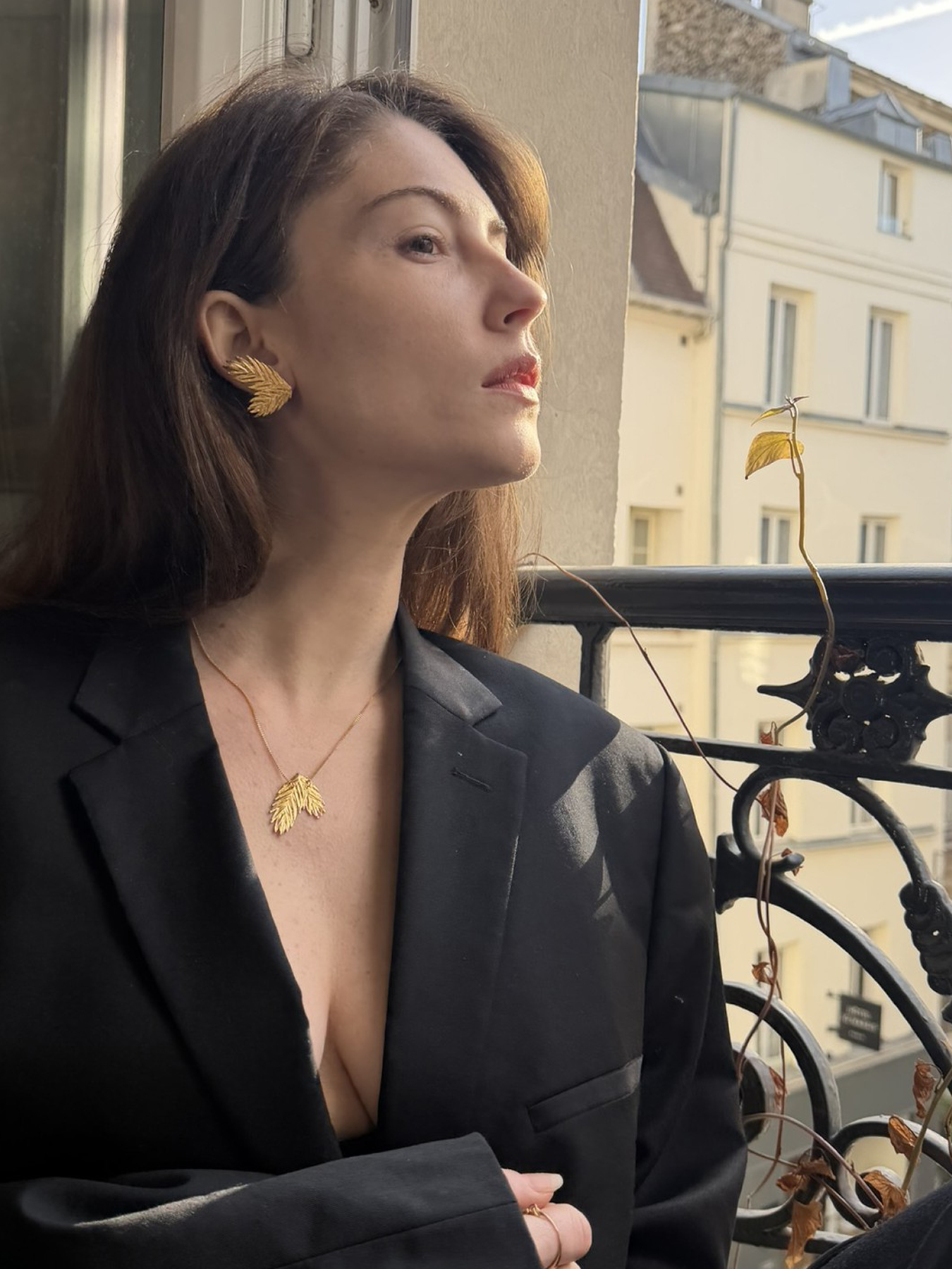 葉の自然な流れやテクスチャーを金属で表現し、軽やかでありながら彫刻的な存在感を備えています。動くたびに繊細な表情を見せ、エレガンスと静かな力強さを併せ持つデザインです。