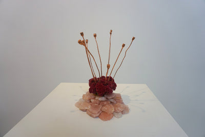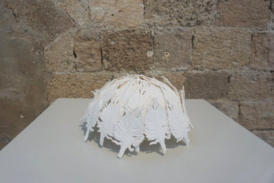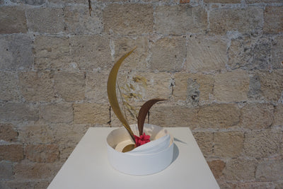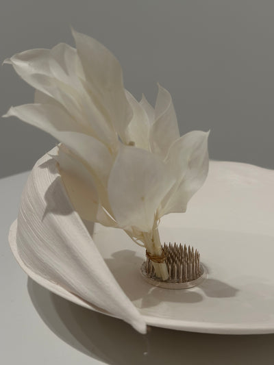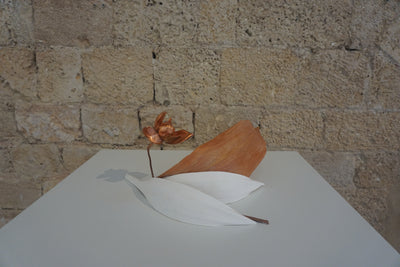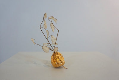 Weinstock combines fragile materials—porcelain, organic substances, flowers, and tree fruits—that could disintegrate at any moment under human touch, yet are eternally preserved within a coating of precious metal. With these, she creates sculptural objects in which presence and absence are intertwined in a balanced way, allowing surrender to beauty and silence.